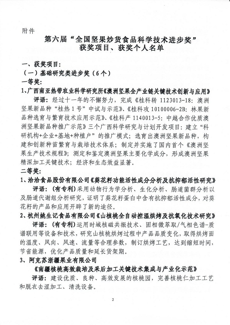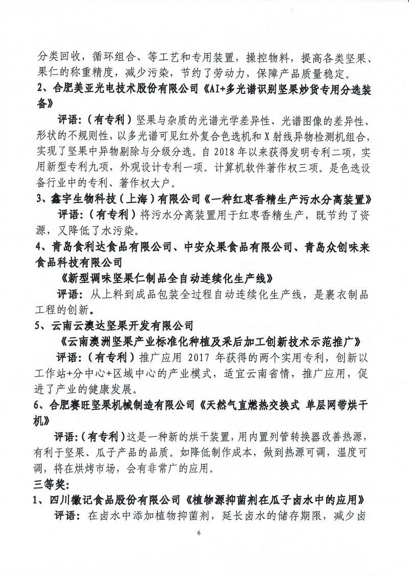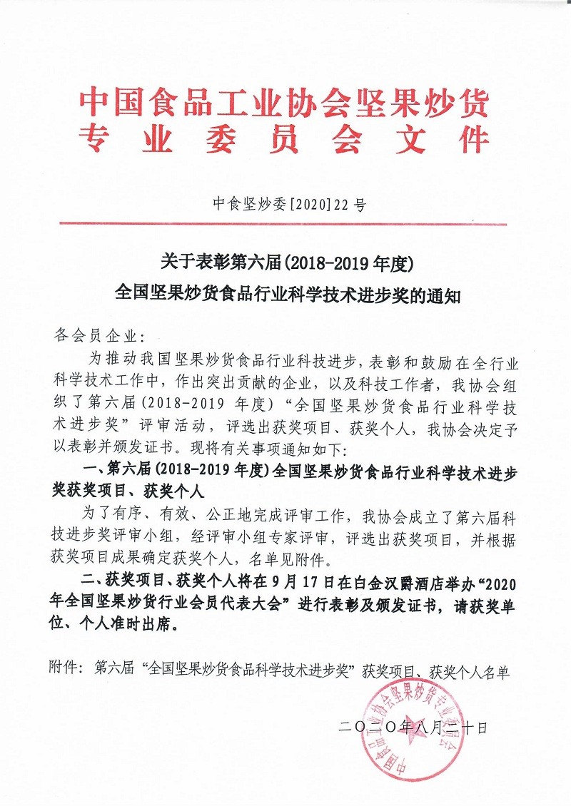 關(guān)于表彰第六屆(2018-2019年度)全國堅果炒貨食品行業(yè)科學(xué)技術(shù)進步獎的通知