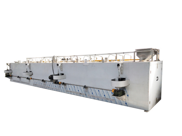 全自動平面回轉(zhuǎn)烤爐主要用于堅果炒貨及籽類產(chǎn)品裹衣裹粉后的烘烤加工。采用直燃式加熱方式,熱量直接作用于食品上,烘烤香味更濃郁,并通過設(shè)備的搖擺避免食品粘連變形。具有烘烤口味色澤優(yōu)良, 沒有污染等特點(diǎn)。