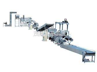 該生產(chǎn)線由燙漬、脫皮和油炸、脫油、拌料兩大部分組成。其中油炸機(jī)可以將進(jìn)入炸鍋的原料從定時(shí)炸制、提鍋淋油、提升倒入脫油筒脫油到輸送出去一氣合成。溫度、油炸時(shí)間、脫油時(shí)間全部由PC機(jī)自動(dòng)控制;炸制效果穩(wěn)定均勻性好,能有效地控制食品含油量。又使得炸品色、香、味俱佳。